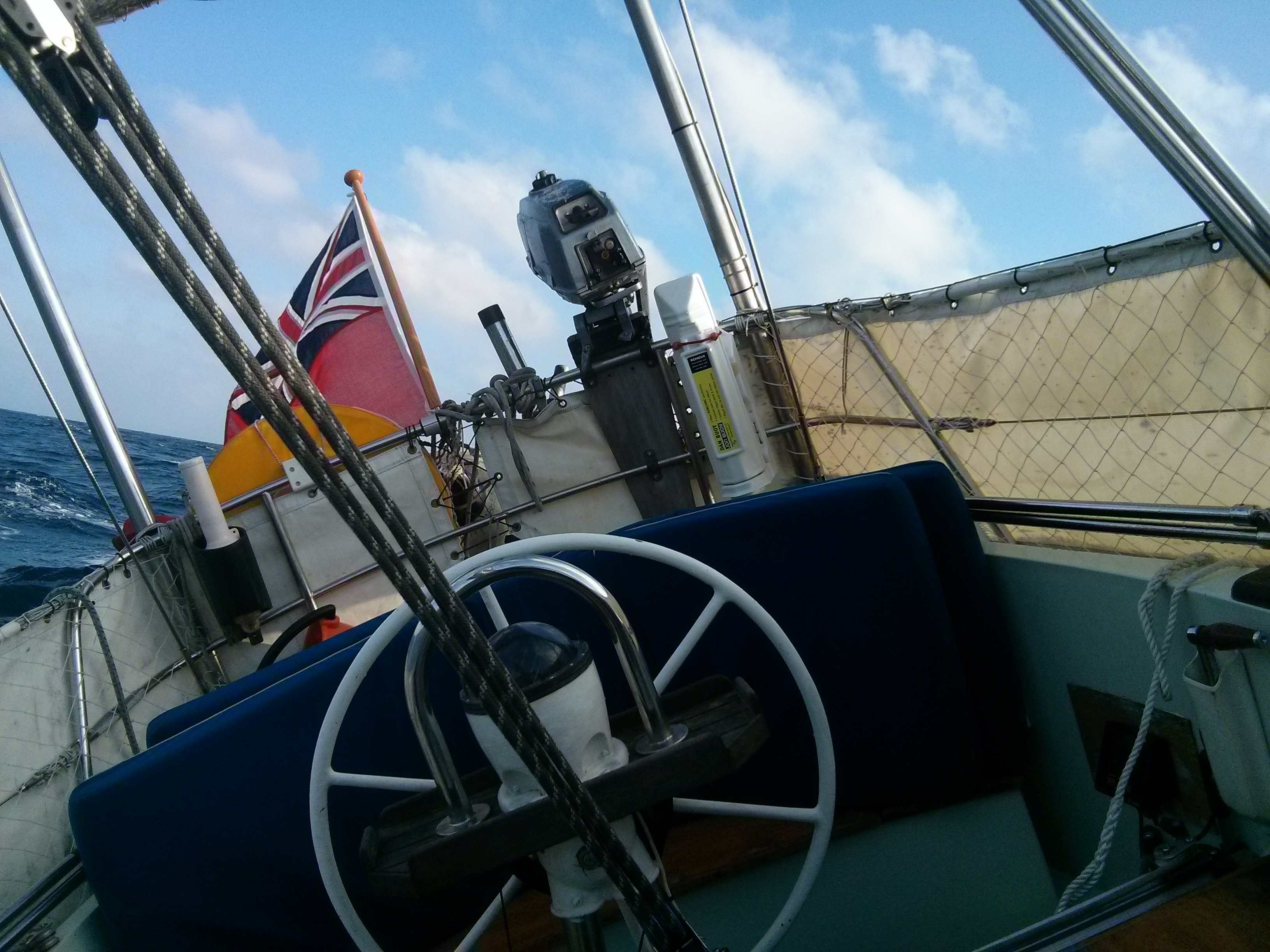 The unpredictability of the constant movement was getting to us; we were battered and bruised from falling into stuff. There was no let up at all, we had the lee cloth up in our watch berth, but constantly being pushed into it, followed by being slammed back against the sofa and back into the lee cloth again meant that we weren’t getting a good sleep when we were off watch. Coupled with the constant rumble of the engine which, although improved since fitting the acoustic insulation, is still like sleeping next to a heavy duty tractor. We had ceased being able to cook a decent meal, despite the gimbles on the cooker, because the restraint bar (that stops us falling into the cooker) had come off, so it became too dangerous to have hot water and open flames around with the pitching and rolling! This meant our eating suffered as we reduced ourselves to water, digestives, crispbreads and tracker bars! Our oilskins, gloves, hats, etc were getting soaked on every watch and couldn’t dry them in time for the next watch, and putting cold, wet gear on gets tiresome and morale-sapping fairly quickly. The toilet had also stopped flushing out effectively, and when we tried to counter this with bleach, it turned into a foaming volcano of bubbles. Every trip to relieve ourselves became fraught with slip hazards and disgust, and only marginally better than risking any other methods of toiletage. Everything was getting to us. We start to forget that we are doing this for fun.